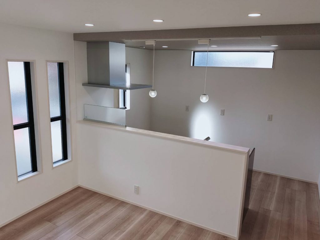 デザイン性:黒のアイアン手すりが空間をスタイリッシュに引き締め、建売住宅の枠を超えた上質なインテリアを実現しました。