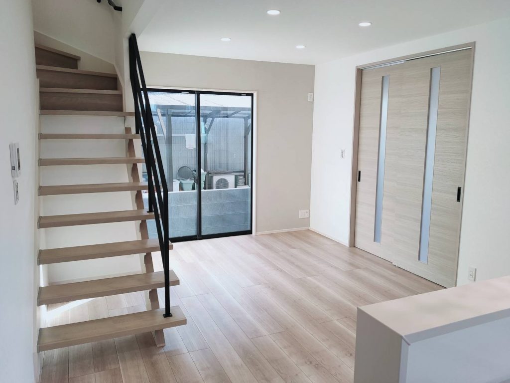 この家の最大の魅力は、玄関から入ってすぐに広がる開放的なLDKと、そこに佇むオープン階段です。